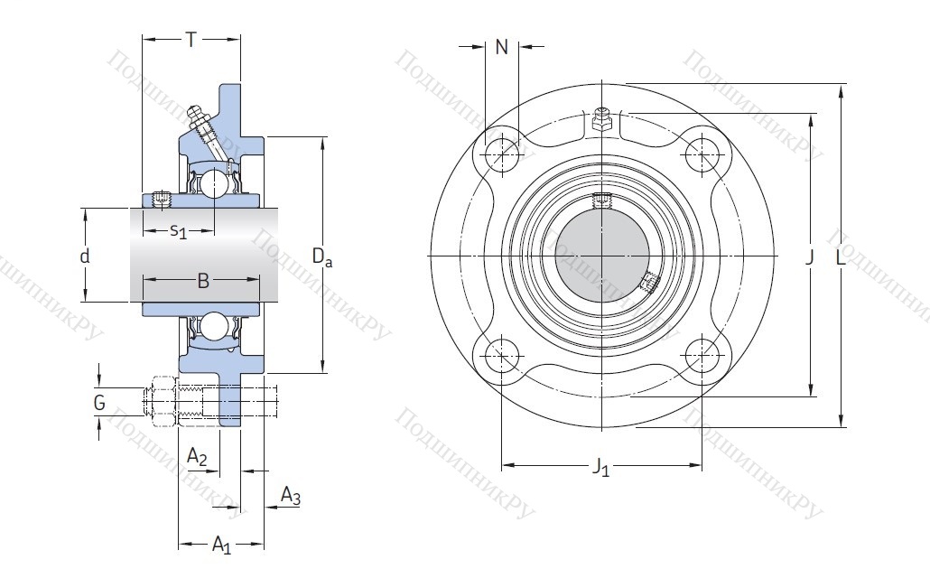 Фланцевая гильза из чугуна или стали оснащена корпусным радиальным шарикоподшипником UC-серии, имеющим внутреннюю обойму удлиненного вида и винтовой стопорной крепеж. Монтаж детали осуществляется методом подгонки.
