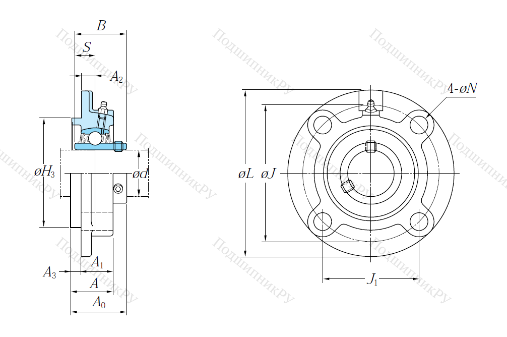 Фланцевая гильза из чугуна или стали оснащена корпусным радиальным шарикоподшипником UC-серии, имеющим внутреннюю обойму удлиненного вида и винтовой стопорной крепеж. Монтаж детали осуществляется методом подгонки.
