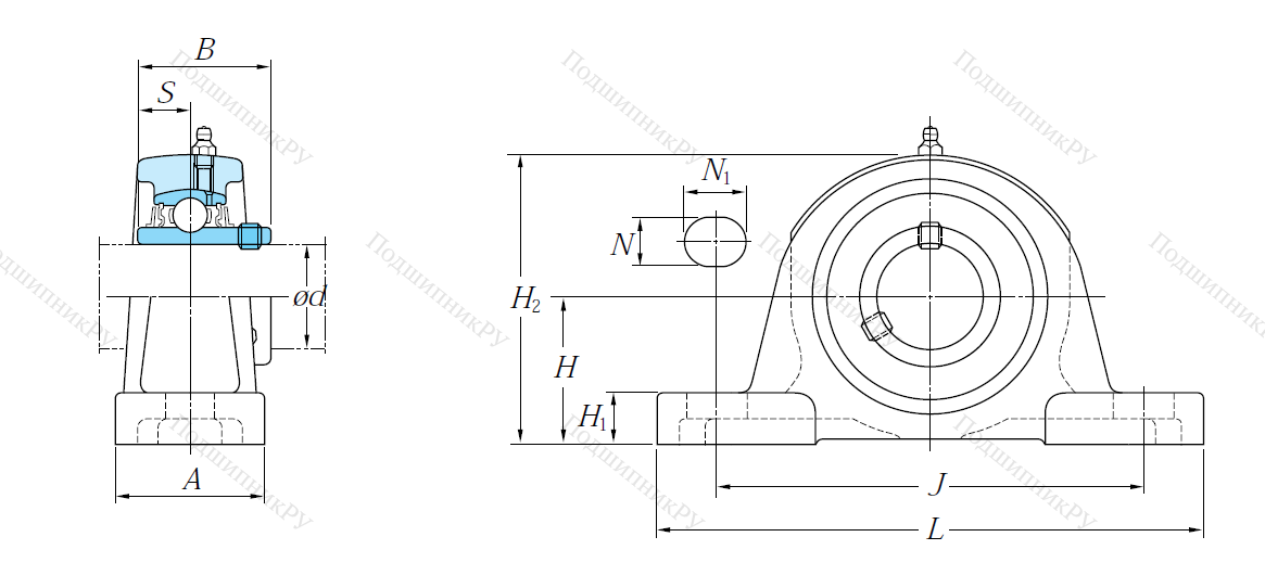 В конструкцию детали входит корпусный подшипник типа UC, установленный в корпус типа Р из чугуна с нишей сферической формы. Монтаж на вал осуществляется посредству кольца, оснащенного парой штифтов, закручиваемых шестигранником, что обеспечивает самовыравнивание.