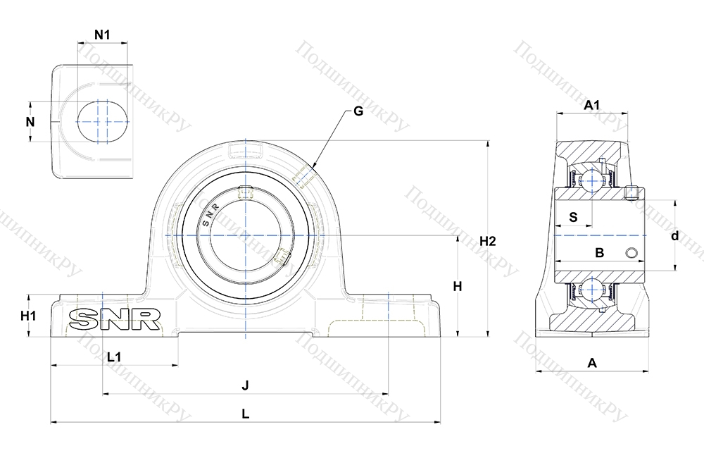 В конструкцию детали входит корпусный подшипник типа UC, установленный в корпус типа Р из чугуна с нишей сферической формы. Монтаж на вал осуществляется посредству кольца, оснащенного парой штифтов, закручиваемых шестигранником, что обеспечивает самовыравнивание.
